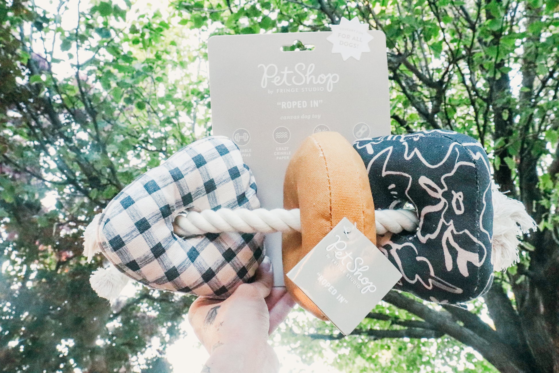 This toy has crinkle noise, squeaker and is made with canvas material.