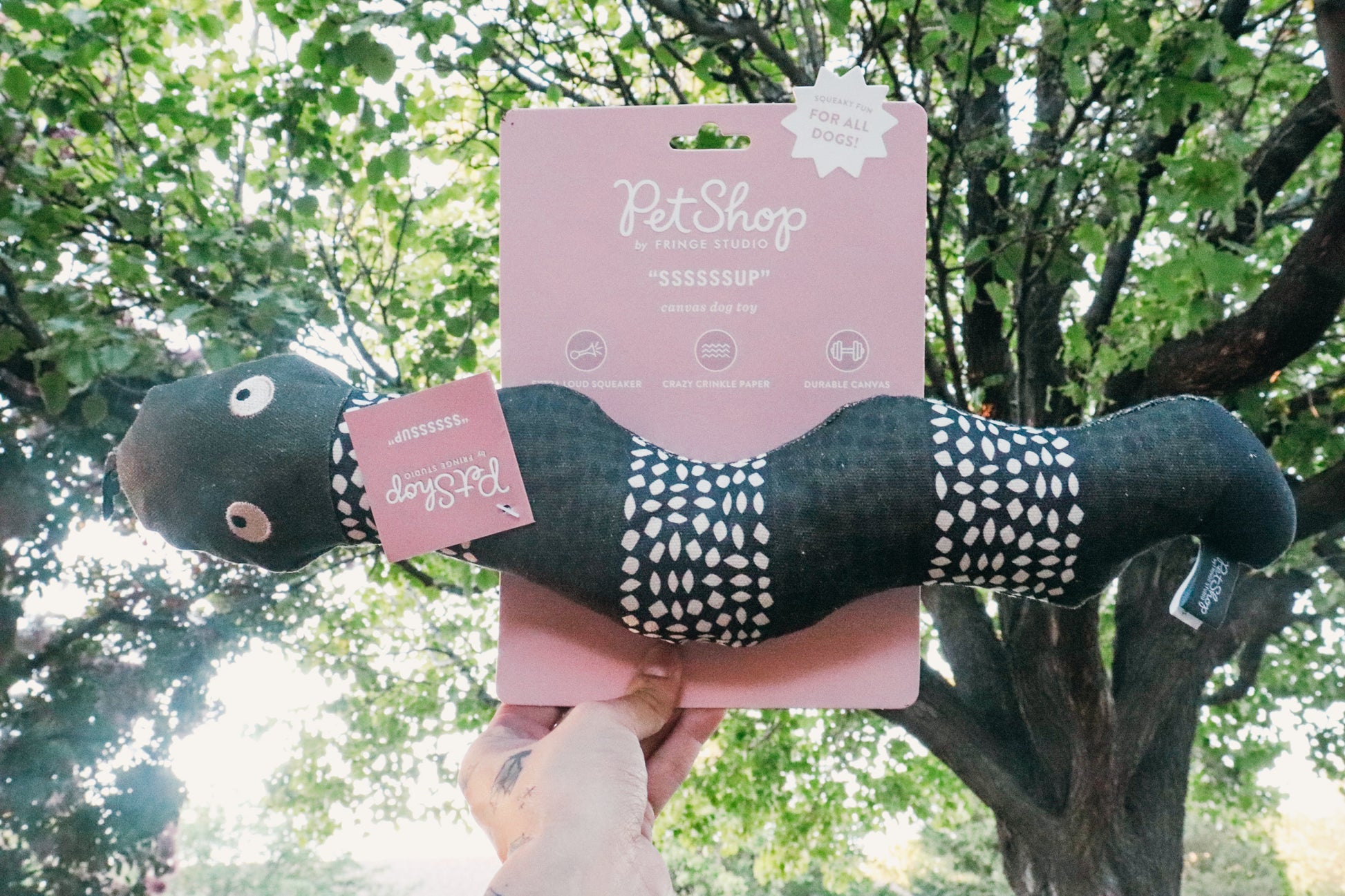 This toy has crinkle noise, squeaker and is made with canvas material.