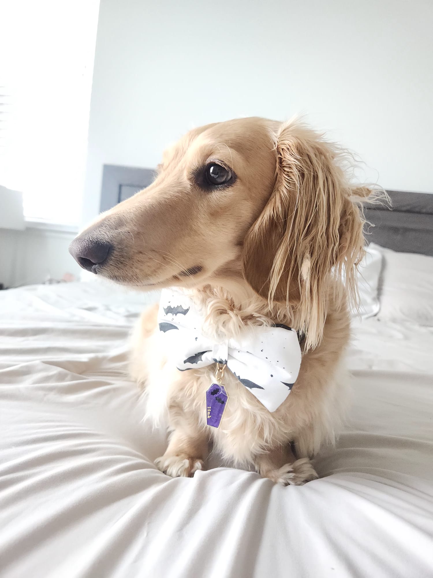 Give your pup a spook-tacular style with our Bat Print Fur Baby Bow! Crafted from premium fabric, this bow features a classic Halloween bat pattern, a gold tag attachment, and a sturdy button clip for secure wear. Perfect for festive walks or Halloween photos!